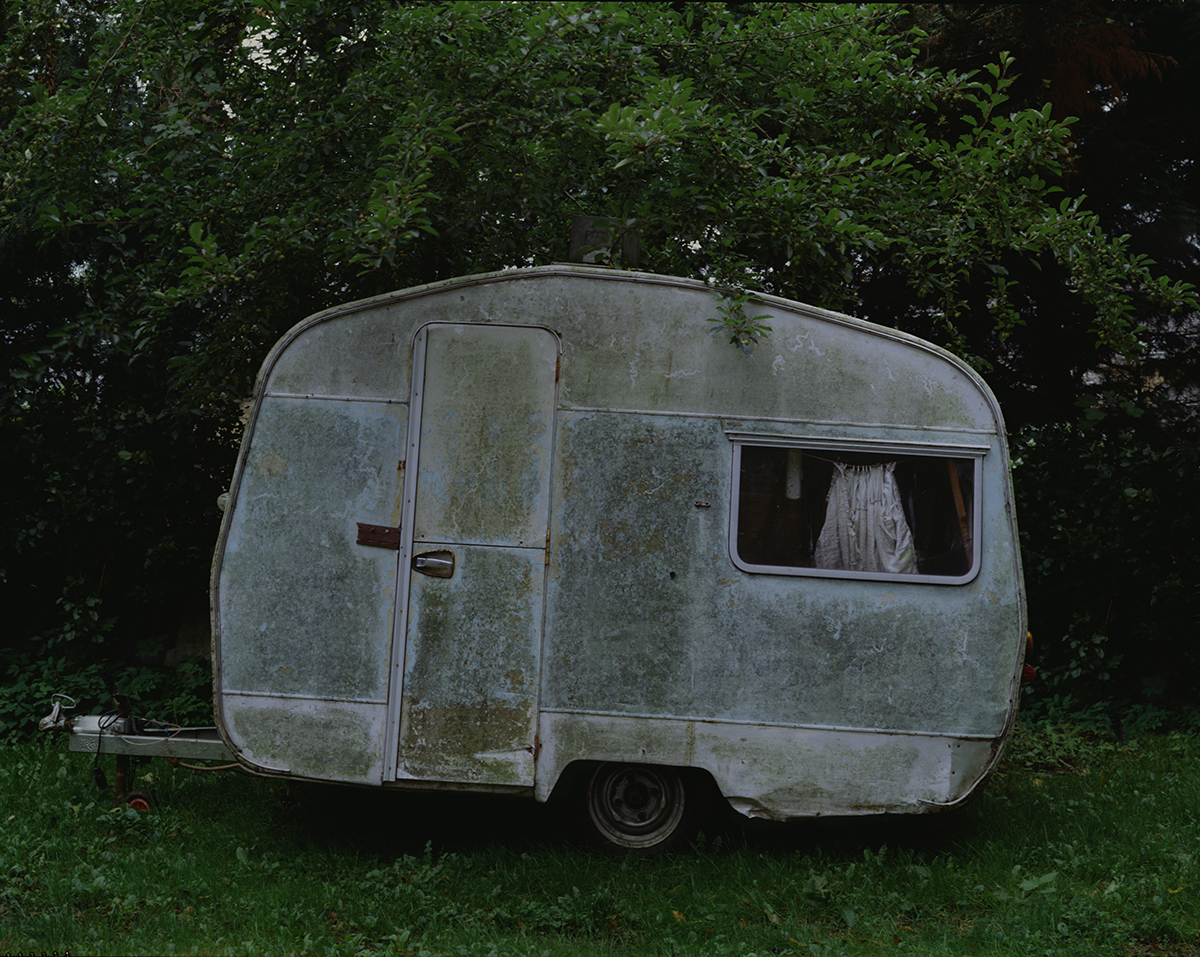 This section also considers ‘vagabondage’ as a radical mechanism for stepping outside of capitalist societal expectations and symbolised by the photographs, shot on large format analogue colour slide film, of isolated ruins of caravans in rural settings to portray life outside of the narrow offerings of late Capitalist Britain. This is exemplified by the stage set for the character of Rooster Byron in the renowned play Jerusalem, who is a theatrical 20th century vagabond hero. This play is one of the most performed plays by amateur dramatic societies in the UK. Portraits of amateur actors that have portrayed Rooster in local productions of Jerusalem in their onstage costumes and included as symbols of resistance, dissent, and radical withdrawal.